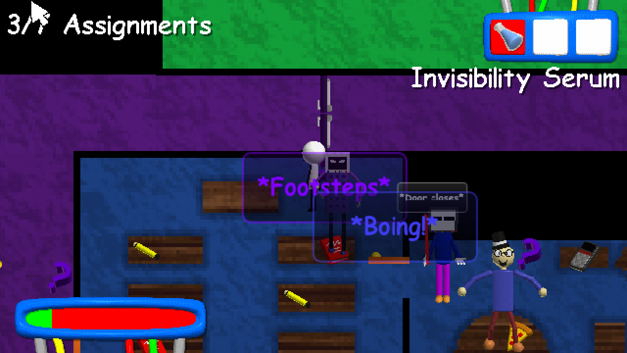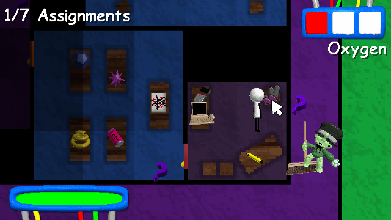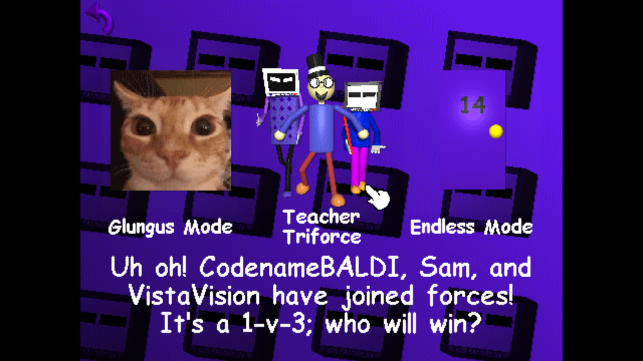 - Teacher Triforce - Double Trouble's first incarnation was nothing noteworthy, mainly due to Codename's AI being stupid and running into walls and such. Now, not only has both his and Vista's AI been completely overhauled, another fellow teacher has joined the mix - SAM! (from Sam's Schoolhouse, my other game!) Due to how differing his behavior is compared to the other teachers (especially due to his jump mechanic), I think his addition will spice up the mode a little bit.